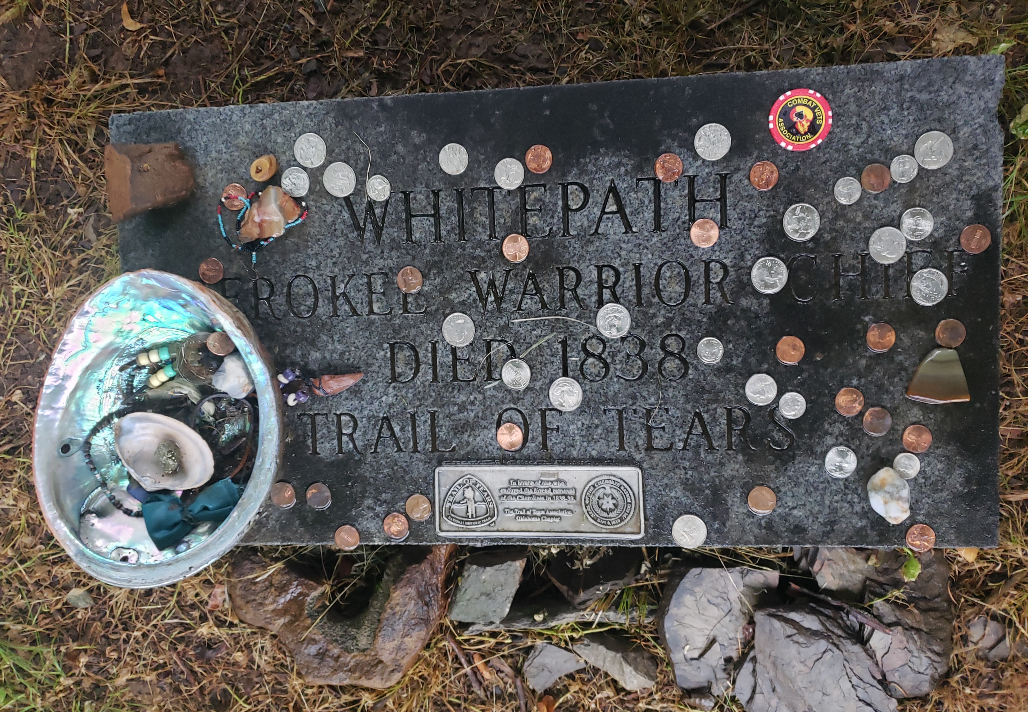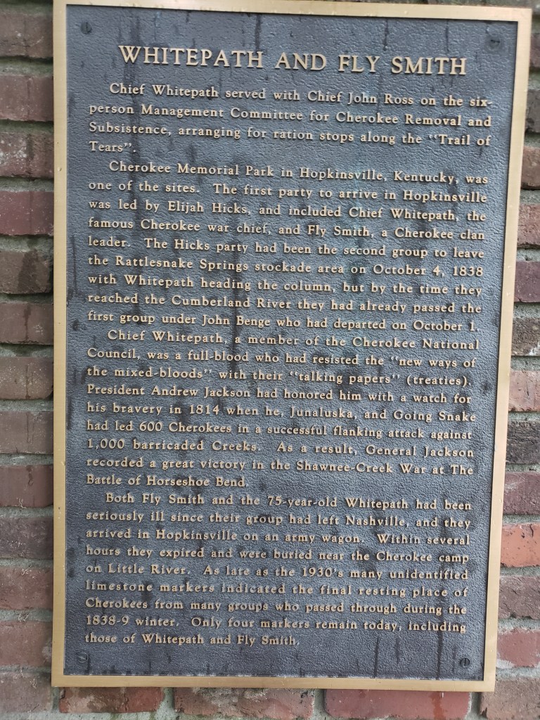 Although the sky has been rumbling for days, the rain didn’t begin to fall until I was about 2 miles south of Hopkinsville, KY. Despite a moderate rain, I biked straight to the Cherokee Trail of Tears Commemorative Park. Upon entry, I discovered that Chief Whitepath and Fly Smith were buried here.