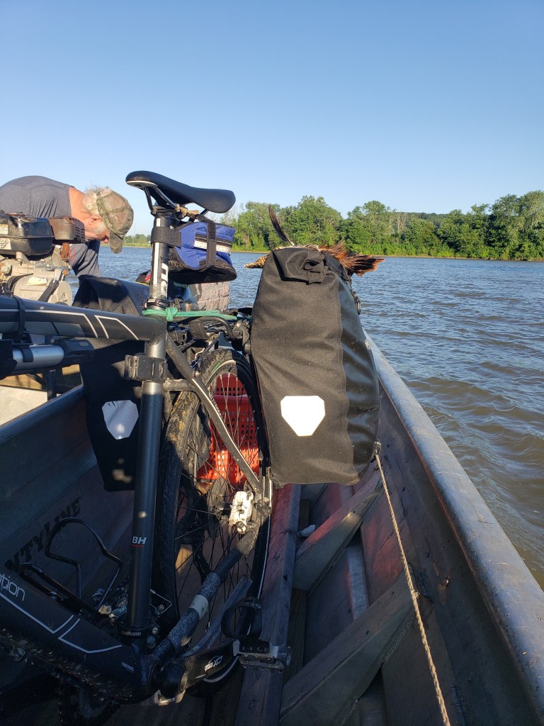 I began my day yesyerday at Berry’s Ferry, KY, a short downhill ride from Mantle Rock, looking out across the Ohio River, the same Ohio River that my namesake’s family has known for several generations residing in Pittsburgh, West Virginia, and Ohio. I noticed a family, that somewhat resembled my hillbilly West Virginia relatives, camping nearby. Attached to their truck was a large fishing boat. I approached them and asked what it would take to get them to transport me and my bike across the river. They said “not much,” considering that they were planning on catfishing in a few minutes. So, like the Cherokee, I crossed one of my family’s sacred rivers by boat. Thx to Jr and company for the help.